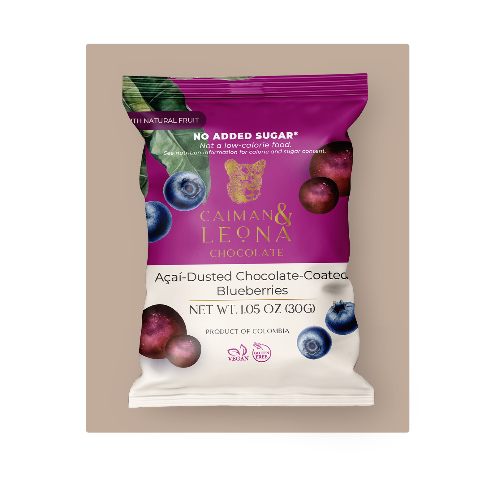 Ingredients: Dark chocolate (organic cocoa mass, allulose, and açaí powder), blueberries.